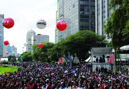 Foi só o tempo abrir para o Vale do Anhangabaú, no centro de São Paulo, se transformar num mar de gente disposta a comemorar o Dia do Trabalhador/a promovido pela Central Única dos Trabalhadores (CUT-SP), com público estimado em 120 mil pessoas. A terça-feira, que começou com ato inter-religioso (veja reportagem), continuou atraindo cada vez mais público com as apresentações de artistas como Paula Fernandes, Renato Borghetti e Elba Ramalho, entre outros.