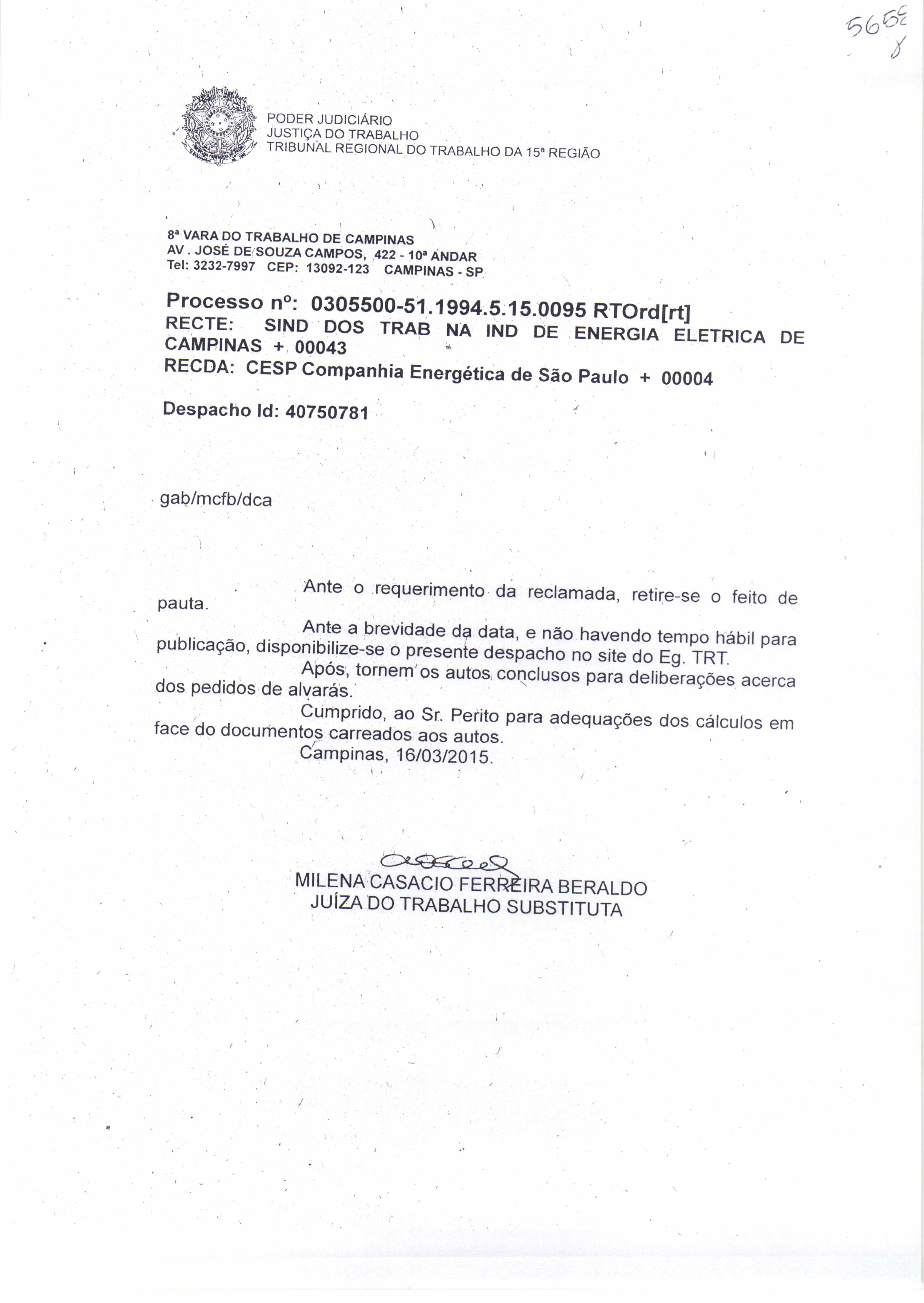 A 8ª Vara do Trabalho de Campinas cancelou hoje (16) a audiência marcada para esta terça-feira (17), às 14h, entre a Cesp e o (STIEEC) Sinergia CUT referente à ação da periculosidade (processo 3055), ajuizada em 1994. O motivo do cancelamento foi que a Cesp entrou na última sexta-feira (13) com uma petição no processo requerendo que o mesmo retorne ao perito judicial para recálculo dos valores de alguns trabalhadores cujo cálculo foi arbitrado por falta de documentos.