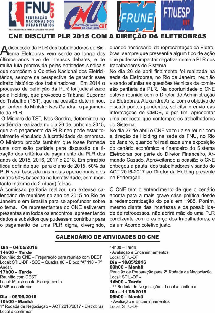 A comissão paritária realizou um extenso calendário de reuniões no ano de 2015 no Rio de Janeiro e em Brasília para se aprofundar sobre o tema. Os representantes do CNE estiveram presentes em todos os encontros, apresentando dados e subsídios que pudessem contribuir para o pagamento de uma PLR digna, divergindo, quando necessário, da representação da Eletrobras, sempre que pressentia algum tipo de ação que pudesse impactar negativamente a PLR dos trabalhadores do Sistema.
