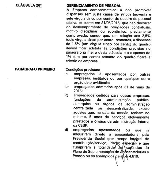 A CESP concordou com a solicitação do Sindicato e, diante da ausência de manifestação das demais citadas, o desembargador Flávio Allegreti de Campos Cooper encerrou a sessão, homologando a solicitação. Entenda mais o caso clicando aqui e veja abaixo a cláusula: