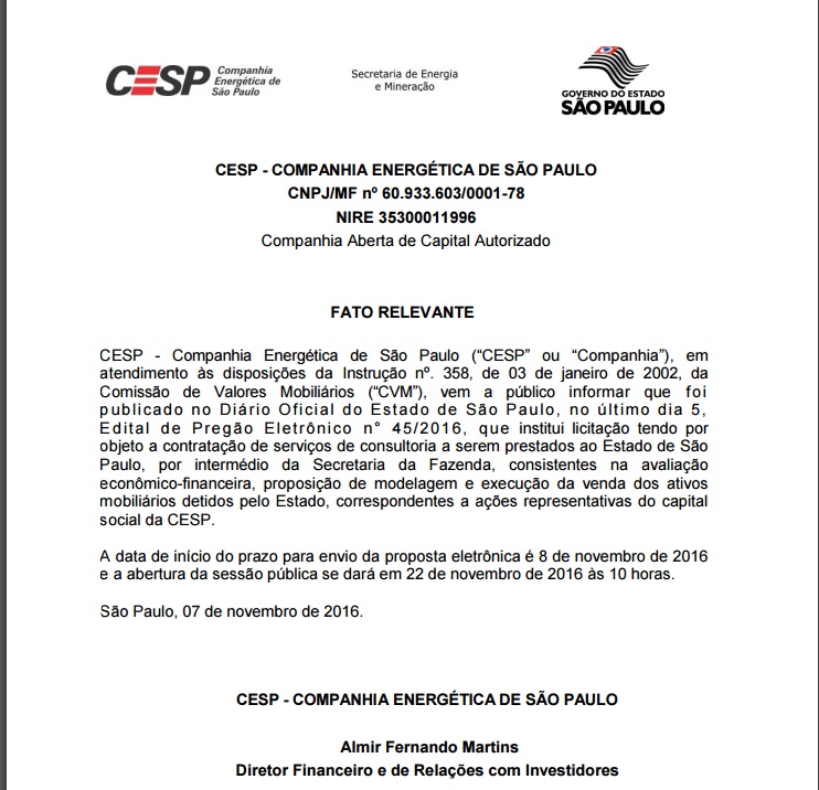 A Cesp publicou em sua página eletrônica uma matéria intitulada “Governo publica edital para modelagem da venda de ações da CESP”. A postagem foi feita em 07/11/2016. Nela, a Companhia avisa que “o Governo do Estado de São Paulo publicou no Diário Oficial do Estado, em 5/11, Edital de Pregão Eletrônico para contratação de consultoria para avaliação econômico-financeira, proposição de modelagem e venda das ações que dispõe no capital social da CESP.” Ao clicar na matéria, abre-se um pdf sobre o “Fato Relevante” (veja abaixo a reprodução). O Sinergia CUT acompanhará esse processo.