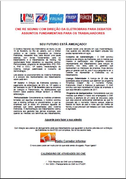 O Sinergia CUT reproduziu o conteúdo do boletim da CNE com o título “Seu futuro está ameaçado!”. Confira clicando em Boletim CNE Reunião Eletrobrás 15 02 2017.