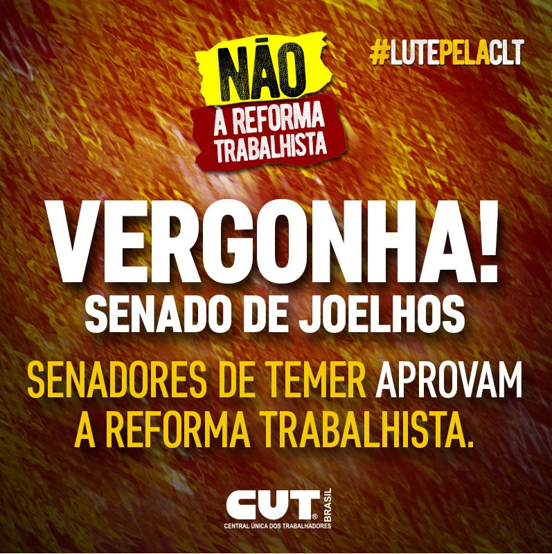 O plenário do Senado aprovou o projeto de lei (PLC 38) de “reforma” da legislação trabalhista. Foram 50 votos a favor e 26 contrários, com uma abstenção. A votação foi concluída por volta das 19h50 de ontem (11), depois de mais de seis horas de sessão suspensa, devido a uma ocupação realizada por um grupo de senadoras da oposição. Conforme queria o governo, o texto foi aprovado sem mudanças.