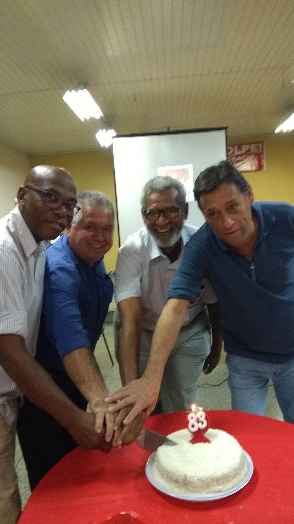 Antes da exposição de Artur Henrique da Silva Santos, ex-presidente do Sinergia Campinas e da CUT Nacional, com o tema “Conjuntura e Desafios das Esquerdas”, uma pausa para comemorar informalmente os 83 anos do Sindicato. A comemoração reuniu os quatro dirigentes que ocuparam a presidência da entidade nos últimos anos – Artur, Wilson Marques, Gentil Freitas e Carlos Alberto Alves.