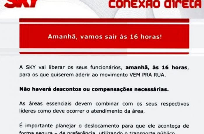A Sky Brasil, empresa concessionária de serviços de telecomunicações que trabalha com TV por assinatura via satélite e internet banda larga 4G, enviou um comunicado liberando os funcionários de todo o país a participar de uma manifestação contra o ex-presidente Lula, organizada pelo movimento Vem pra Rua, um grupo de extrema direita brasileiro, na terça-feira (3), um dia antes de o Supremo Tribunal Federal (STF) retomar o julgamento do pedido de habeas corpus preventivo de Lula.