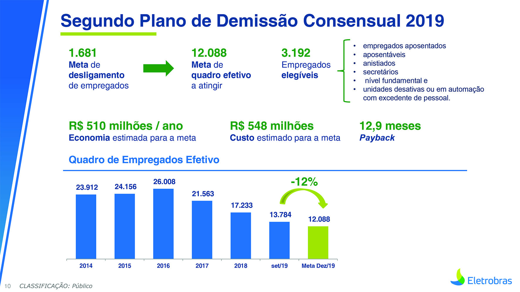 O primeiro slide, batizado de “Segundo Plano de Demissão Consensual 2019”, aponta para a demissão de 1.681 trabalhadores efetivos até abril do ano que vem, com a meta de reduzir o quadro de pessoal para apenas 12.088 profissionais antes da pretendida privatização. Segundo o atual presidente da empresa, esse plano de demissão tem como público alvo 3.192 trabalhadores, incluindo aposentados, aposentáveis, anistiados, secretários, profissionais de nível fundamental e locados em unidades desativadas ou em processo de automação.