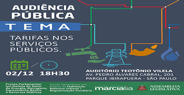 Acontece na próxima segunda-feira, 02 de dezembro, na Assembleia Legislativa de São Paulo (Alesp), uma Audiência Pública para discussão das tarifas nos serviços públicos.