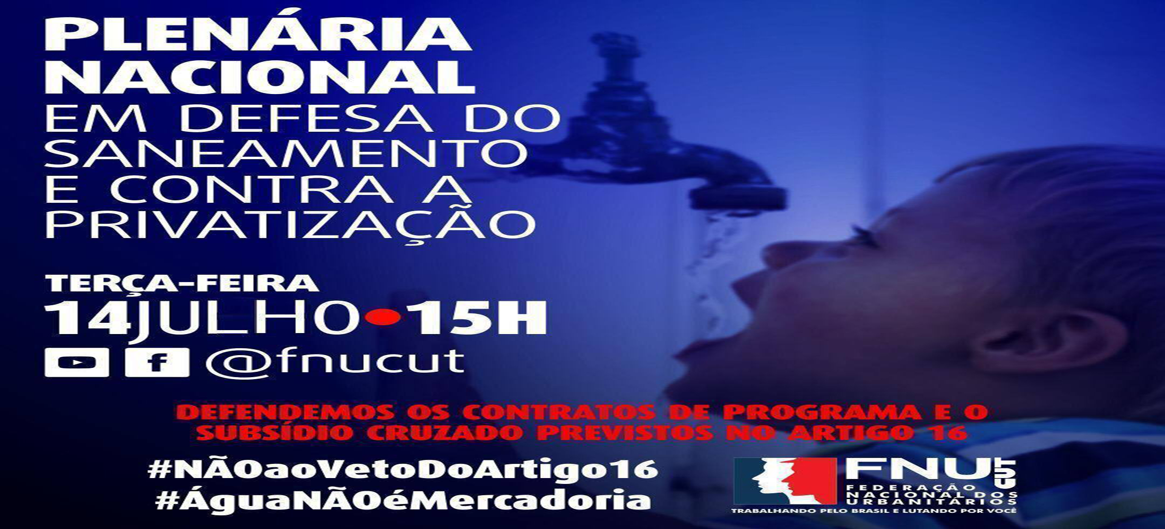 A Federação Nacional dos Urbanitários (FNU) realiza, nesta terça-feira (14), às 15h, uma Plenária Nacional em Defesa do Saneamento e Contra a Privatização, em defesa dos contratos de programa e o subsídio cruzado previstos no artigo 16 do Projeto de Lei (PL) nº 4.162/2019, do novo marco legal do saneamento básico, aprovado no Senado no dia 24 de junho.