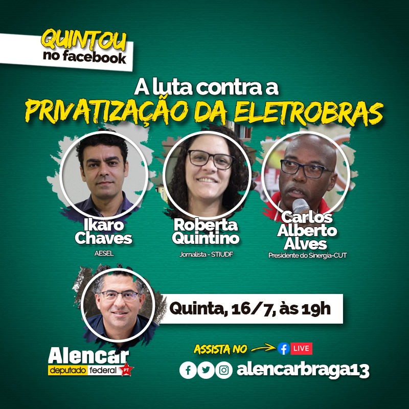 O Deputado Federal Alencar Santana Braga (PT/SP), realiza nesta quinta-feira (16), às 19 horas, Live sobre A Luta Contra a Privatização da Eletrobras.