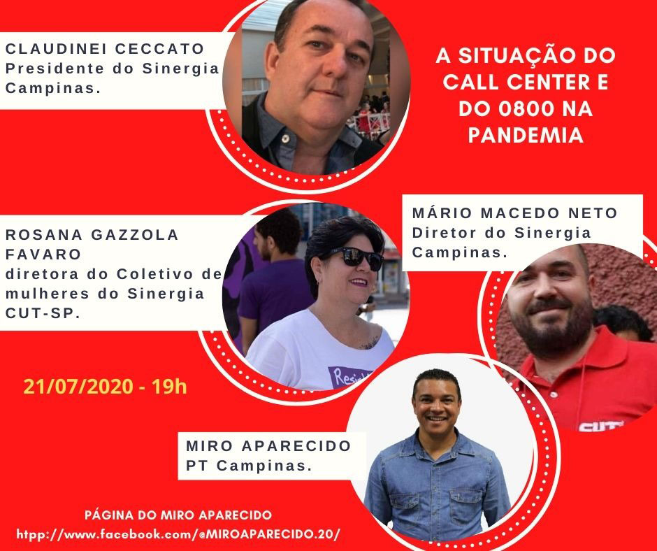 A discussão será sobre “A situação do Call Center e do 0800 na Pandemia” e trará como debatedores Claudinei Ceccato, Presidente do Sinergia Campinas; Rosana Gazzolla Favaro, diretora do Coletivo de Mulheres do Sinergia CUT; e Mário Macedo Neto, diretor de Formação Sindical do Sinergia Campinas.