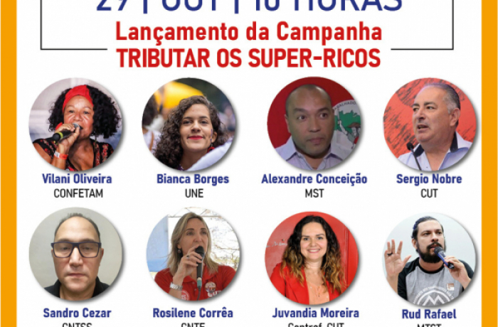 Para lançar a ‘Campanha Tributar os Super-Ricos’, será realizado um debate virtual que contará com a participação do governador do Maranhão, Flávio Dino, de parlamentares e de representantes da CUT, do Movimento dos Trabalhadores Sem Terra (MST), da Confederação Nacional dos Trabalhadores do Ramo Financeiro da CUT (Contraf-CUT), Confederação Nacional dos Trabalhadores em Educação (CNTE), Confederação Nacional dos Trabalhadores em Seguridade Social (CNTSS), União Nacional dos estudantes (UNE), Movimento Trabalhadores sem Teto (MTST) e da Confederação dos Trabalhadores no Serviço Público Municipal (Confetam/CUT),