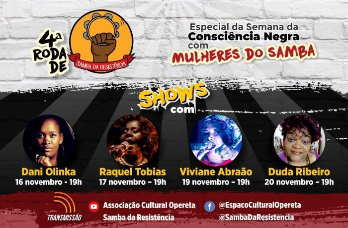 A programação da 4ª Roda de Samba da Resistência segue com o Especial Semana da Consciência Negra com Mulheres do Samba. Entre os dias 16 e 20 de novembro serão transmitidos quatro shows, sempre às 19h, nas páginas do Samba da Resistência e da Associação Cultural Opereta no Facebook e no Youtube.