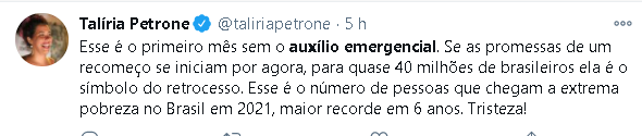 Outra parlamentar também falou sobre o benefício em sua rede nesta terça-feira (5). A deputada Talíria Petrone (PSOL-RJ) afirmou que o fim do auxílio é um retrocesso no país.
