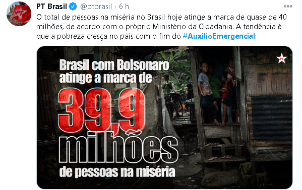 O PT também denunciou: “A tendência é que a pobreza cresça no país com o fim do auxílio emergencial.