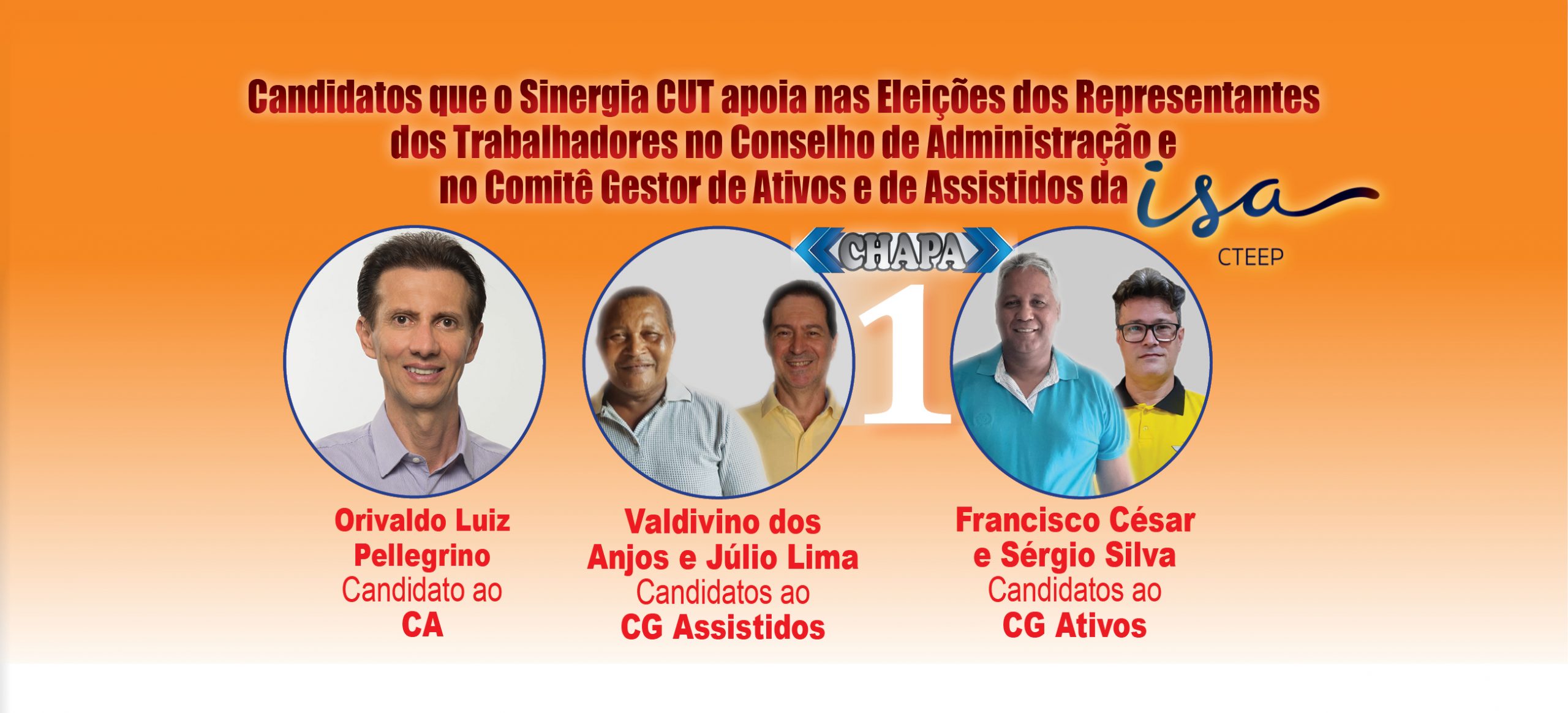 É por isso que o Sinergia CUT apoia os candidatos Orivaldo e os das Chapas 1, que já demonstraram compromisso, experiência e capacidade de intervenção para lutar pelos direitos dos trabalhadores. A votação acontece de 7 a 9 de fevereiro. O Sinergia CUT recomenda o voto em Orivaldo para o CA e nas Chapas 1 para o CG de Ativos e Assistidos!