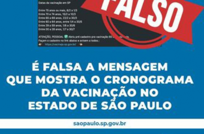 O alerta é do governo de João Doria (PSDB) que ressalta que a mensagem tem dados antigos com datas de vacinação até para faixas etárias de “00 a 28 anos”. A vacina não foi testada em menores de idade e, por isso, ainda não há cronograma para o grupo.