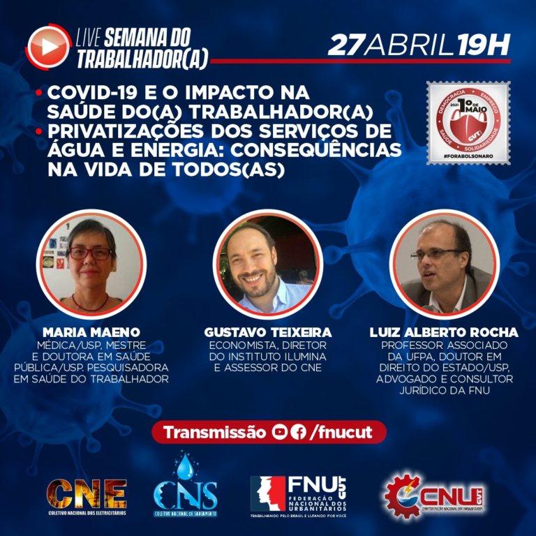 O impacto da pandemia da Covid-19 na saúde dos(as) trabalhadores(as) e as consequências das privatizações dos serviços de água e energia elétrica na vida de todos(as) são os temas da live que o ramo urbanitário realiza na Semana do Trabalhador(a) – terça-feira, 27 de abril, às 19h. (Transmissão pelo YouTube e Facebook: fnucut)