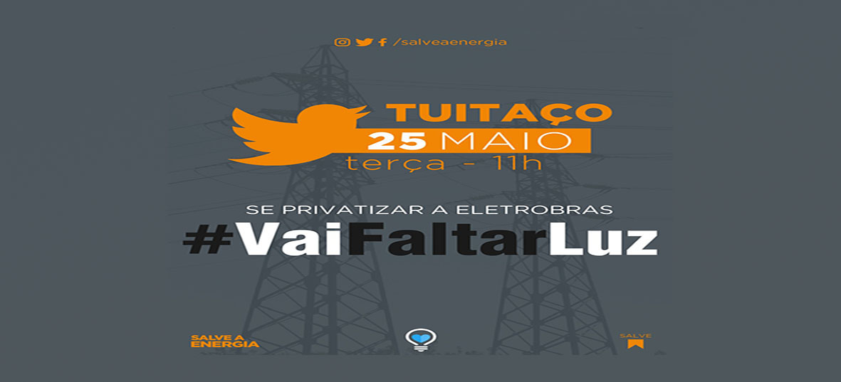 Nesta terça (25), às 11h, tem tuitaço contra a privatização da Eletrobras. Nas redes sociais vamos usar a hashtag #VaiFaltarLuz. É hora de cobrar dos parlamentares o compromisso em defender a Eletrobras pública e alertar a população sobre os impactos desse projeto de destruição.