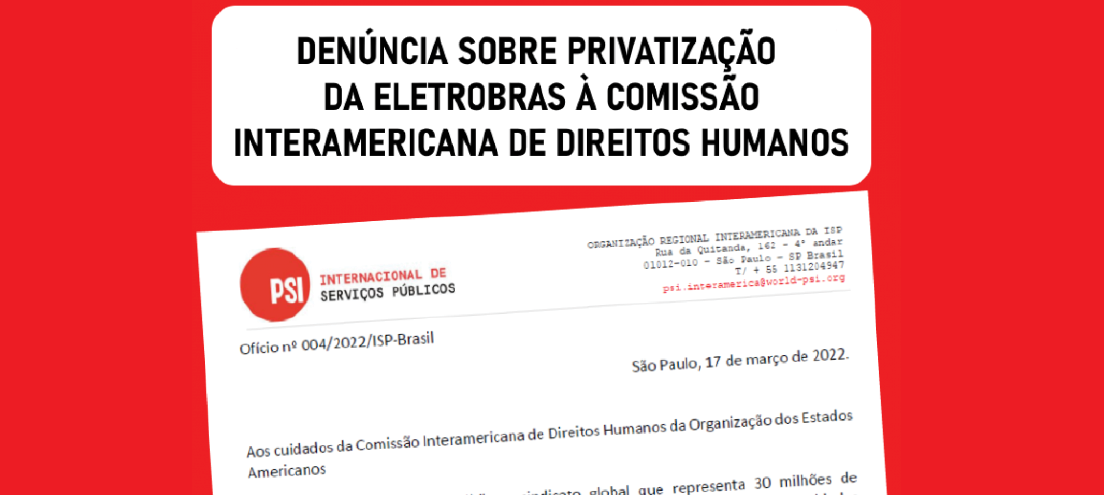 São Paulo, 17 de março de 2022.Aos cuidados da Comissão Interamericana de Direitos Humanos da Organização dos Estados AmericanosA Internacional de Serviços Públicos, sindicato global que representa 30 milhões de trabalhadoras e trabalhadores em 154 países, saúda e apoia a iniciativa de entidades sindicais e da sociedade civil brasileira de denunciar o processo de privatização da Eletrobrás – Centrais Elétricas Brasileiras S.A – na Comissão Interamericana de Direitos Humanos (CIDH). A fundamentação da peça de denúncia, já protocolada, destaca um aspecto fundamental de toda a operação comandada pelo governo do Presidente Jair Bolsonaro: o desprezo a direitos humanos da população.Ao intencionar vender a empresa estatal de energia a toque de caixa, com a ajuda de manobras apontadas como fraudulentas, o governo escancara sua motivação meramente econômica de curtíssimo prazo e ignora a necessidade de milhões de cidadãos que dependem do fornecimento de energia elétrica, notadamente as parcelas mais carentes. O governo também pisoteia questões ambientais implicadas no processo e menospreza os ritos jurídicos ao tentar negar, através de prazos forjados ao arrepio do processo legal, a oportunidade de questionamentos. Em suma, como afirmado pelo conjunto de entidades que protocolaram a denúncia, a venda tal como concebida coloca a questão monetária imediata acima da dignidade humana do povo brasileiro.A denúncia se faz especialmente importante porque, como vimos, coloca em relevo aspecto pouco abordado em negócios como a privatização de patrimônio público, que é a violação de direitos humanos da população. O serviço público não é mera operação comercial, e sim parte essencial da estrutura que deve garantir o direito à vida das populações e, em plano mais amplo, à soberania das nações, aspecto importante quando ainda enfrentamos a pandemia de Covid 19 e suas sequelas que infelizmente perdurarão.Fruto de uma ação coletiva e unitária que reúne diferentes movimentos sociais, a denúncia tem entre seus outros méritos o de inserir a privatização autoritária da Eletrobras na agenda internacional, que neste período histórico faz diversos países reverem os mitos neoliberais que colocavam a ação dos mercados como panaceia de todos os males.Outro aspecto importante é o negacionismo sobre o avanço do controle social vigente no governo, impedindo que a sociedade exerça o direito de participar das decisões que interferem em sua vida e moldar a gestão do Estado ao desejo de um pequeno grupo de mandantes de ocasião.A defesa da vida deve estar acima do lucro, por isso nos dirigimos ao pleno da CIDH, inclusive como representantes internacionais da FNU – Federação Nacional dos Urbanitários, também signatária da denúncia e afiliada à ISP e nos posicionamos solicitando que considerem e aceitem formalmente a denúncia em pauta, dando os encaminhamentos necessários para conduzir as investigações e decisões solicitadas.Atenciosamente,Denise Motta DauSecretária Subregional da Internacional de Serviços Públicos para o Brasil